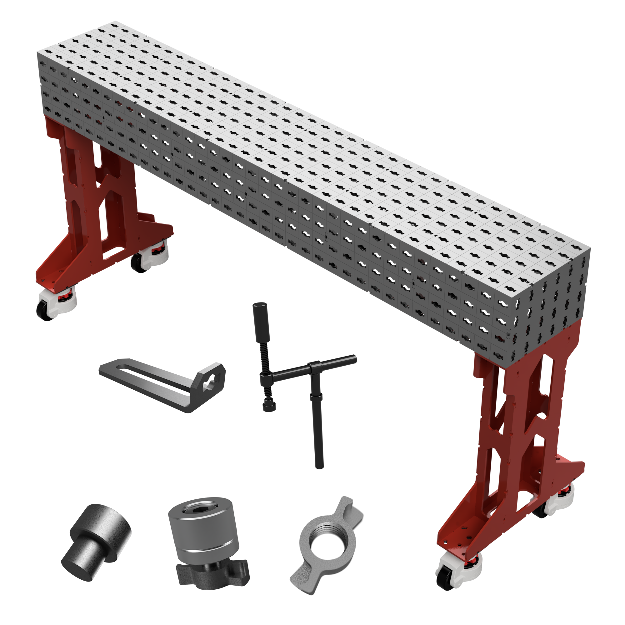 parois 6 mm, empreintes BFS Ø16 mm au pas de 50 mm sur toutes les faces - 2 tréteaux acier EKI — pieds réglables ±15 mm,